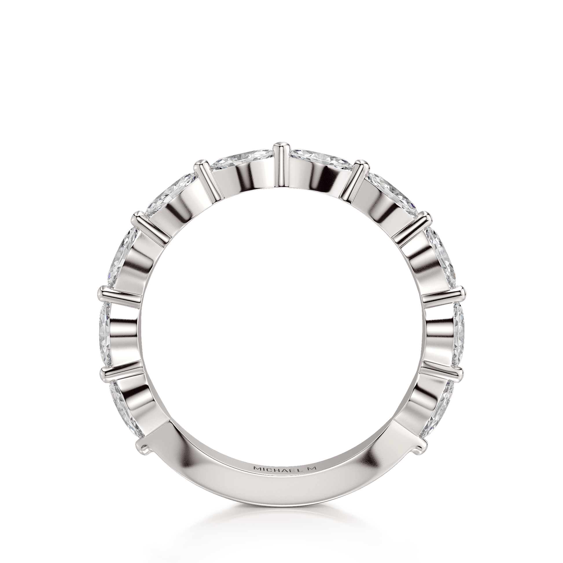 This MICHAEL M wedding band is adorned with diamonds handpicked by a certified MICHAEL M gemologist, each side stone has a minimum average color of G, a minimum average clarity of VS, and are hand-placed in an elegant prong setting by one of MICHAEL M’s master artisans.
