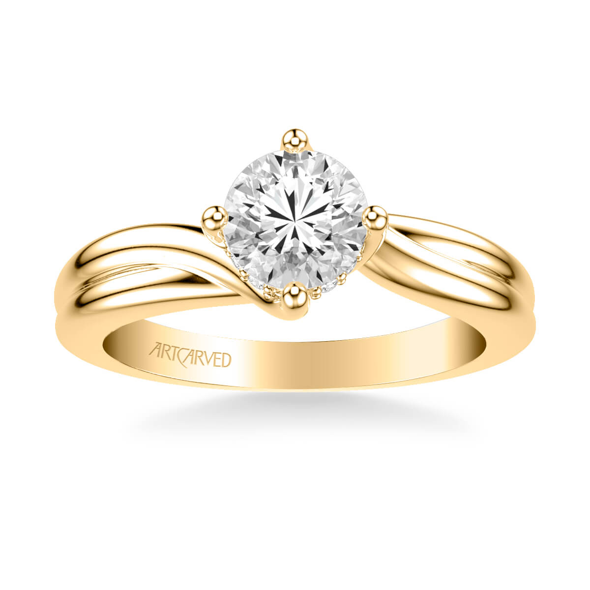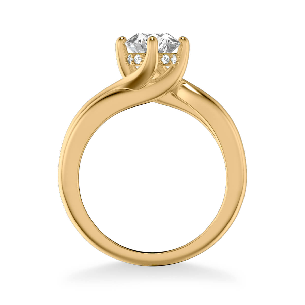 This Solitaire Diamond Engagement Ring will sweep you off your feet. The Solitaire is nestled in a diamond accented basket. The sweeping twist creates the impression of movement in this graceful and modern ring.
